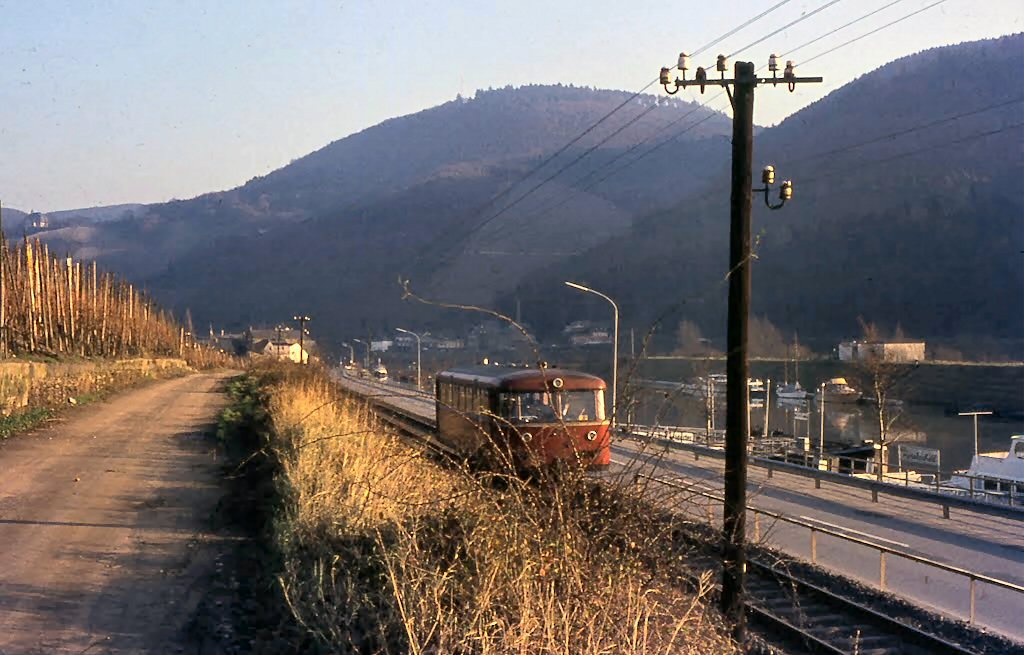 Ca. 1970: Triebwagen der VT (7)95 Baureihe am Kueser Hafen.