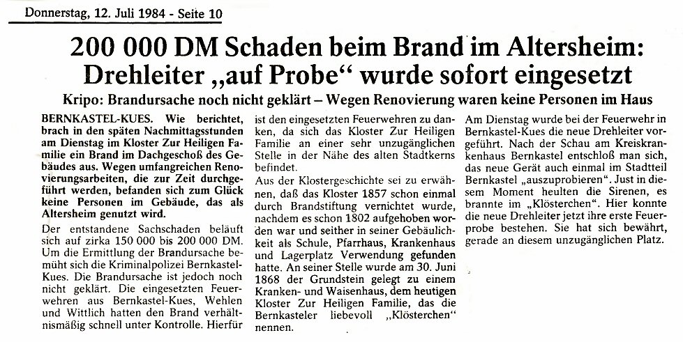 Brand im Klösterchen am 10. Juli 1984.