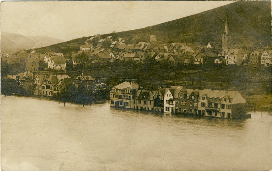 Hochwasser in den 1920ern. Gaststätte Etteldorff am Ende des Nikolausufers Richtung Lieser.