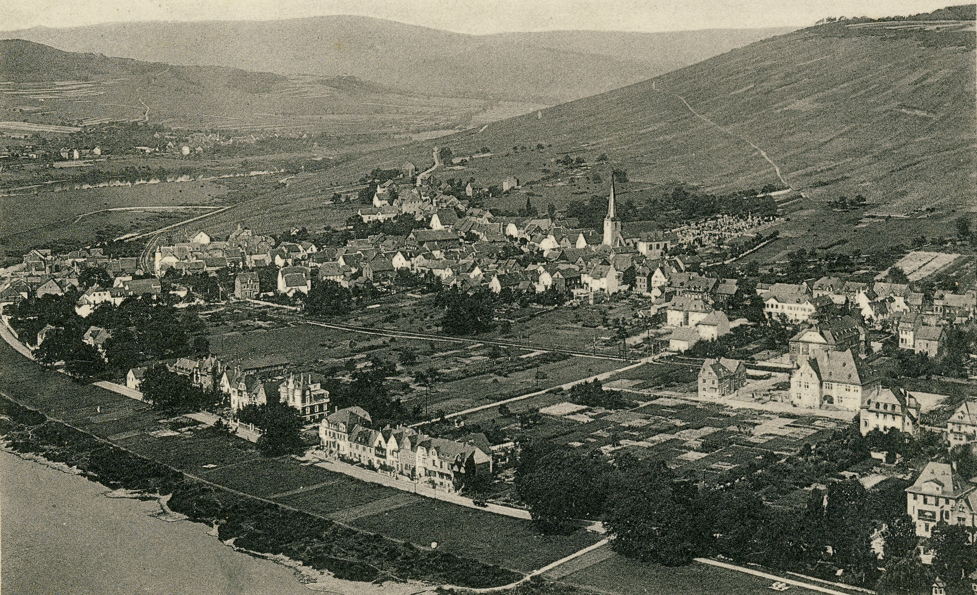 1930er: Blick vom Haus der Familie Junk über den Garten auf die andere Moselseit und die Burg