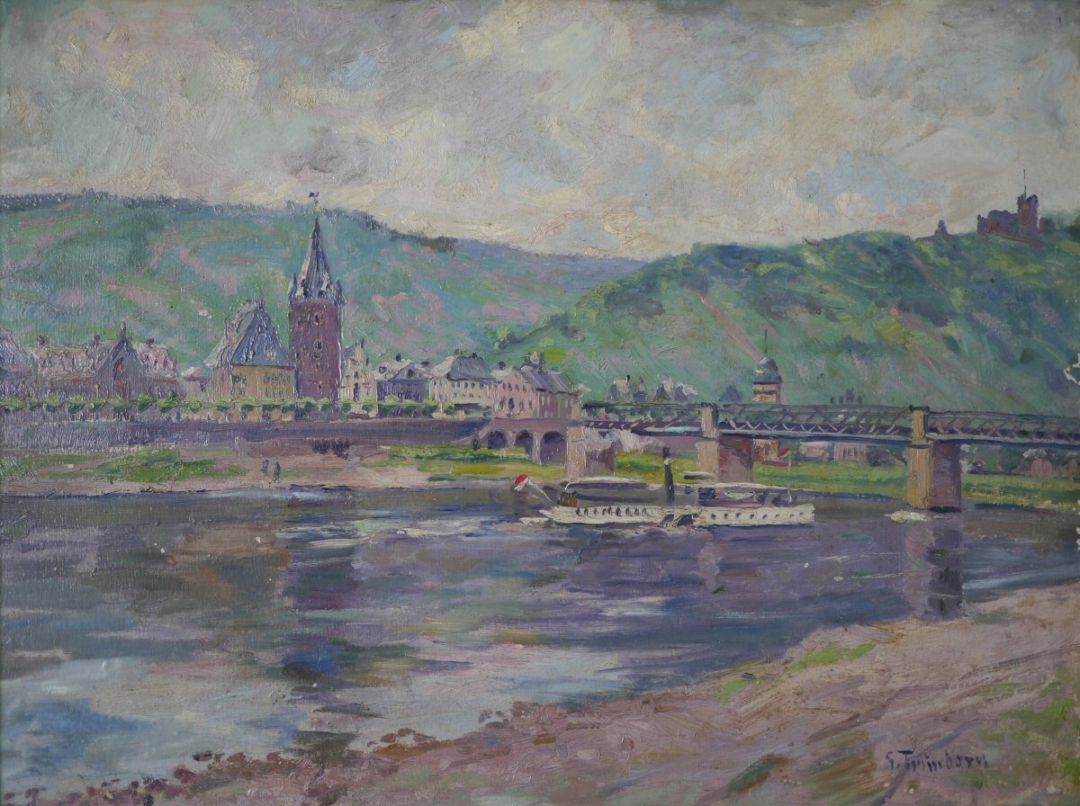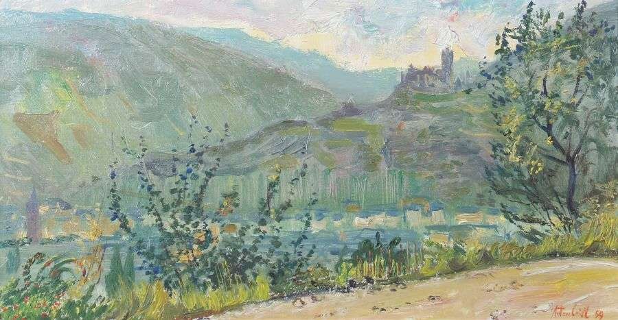 Blick über die Mosel auf Bernkastel und die Burg Landshut. Gottfried Trimborn, Ö,;l auf Karton, etwa 1920.