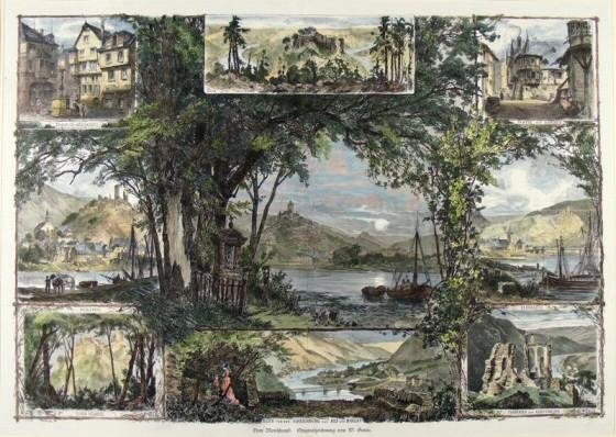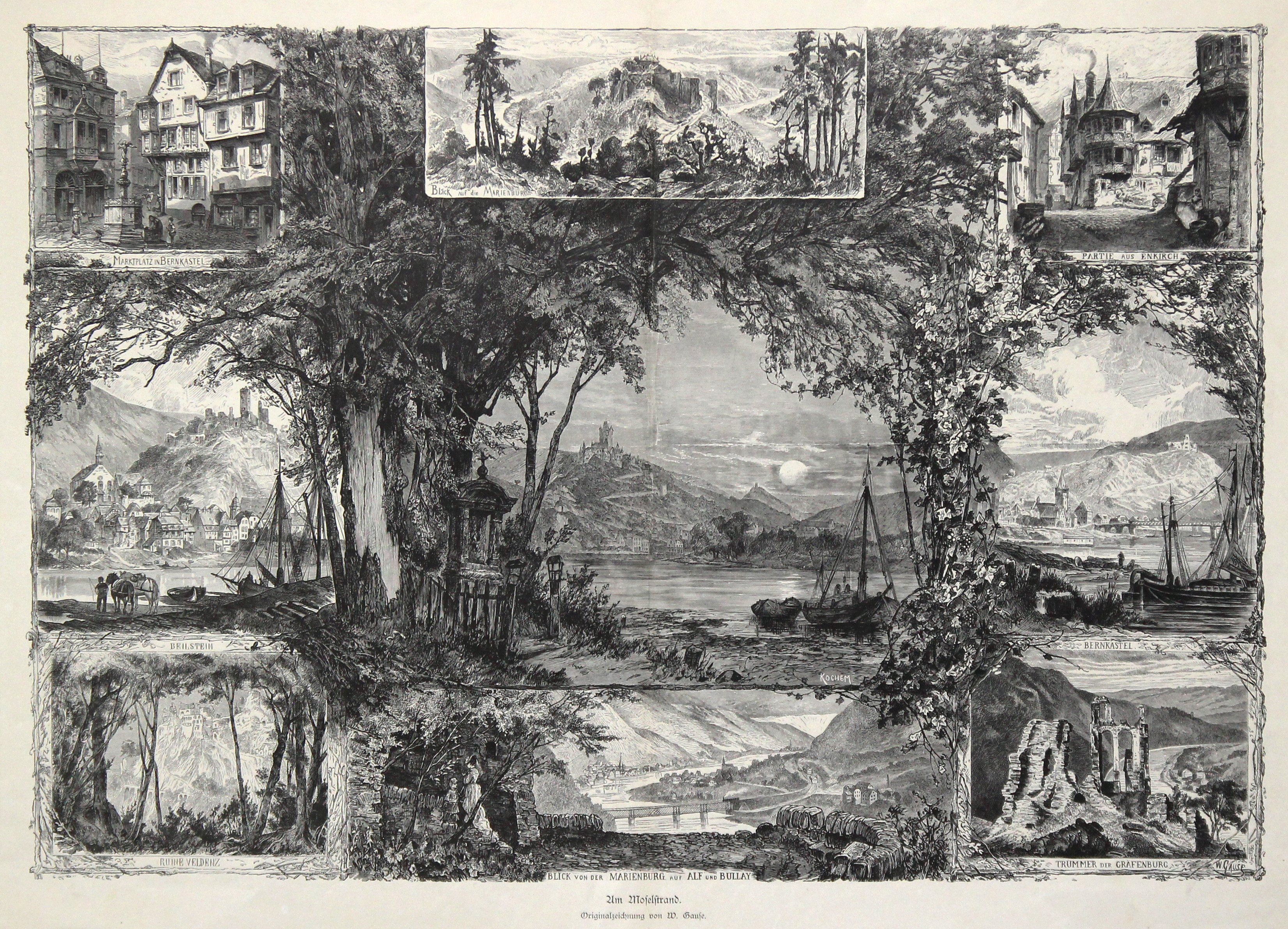 Kolorierter Holzstich nach Wilhelm Gause, ca. 1880. Ca. 34,5 x 50 cm. Sammelblatt mit 9 Ansichten von Moselorten, verbunden durch eine