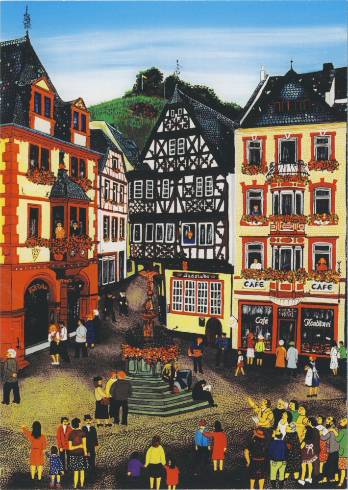 Meine Heimatstadt Bernkastel mit Marktplatz. Hinterglasmalerei.