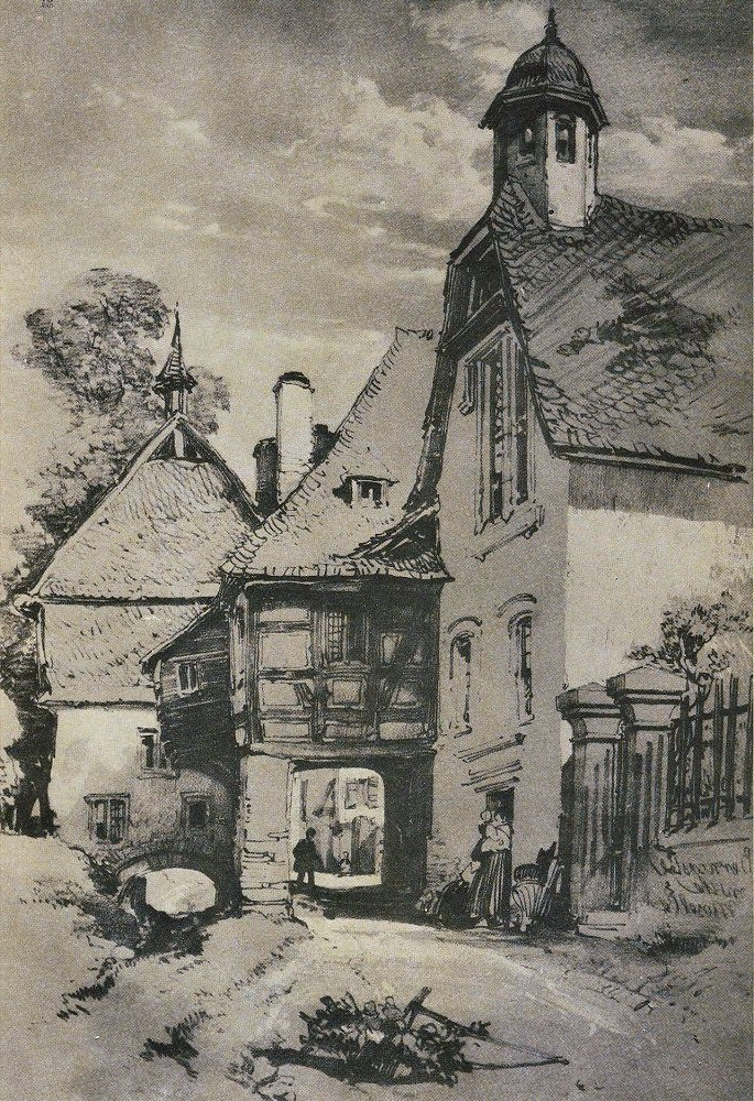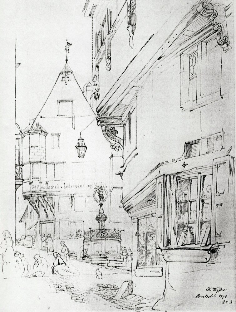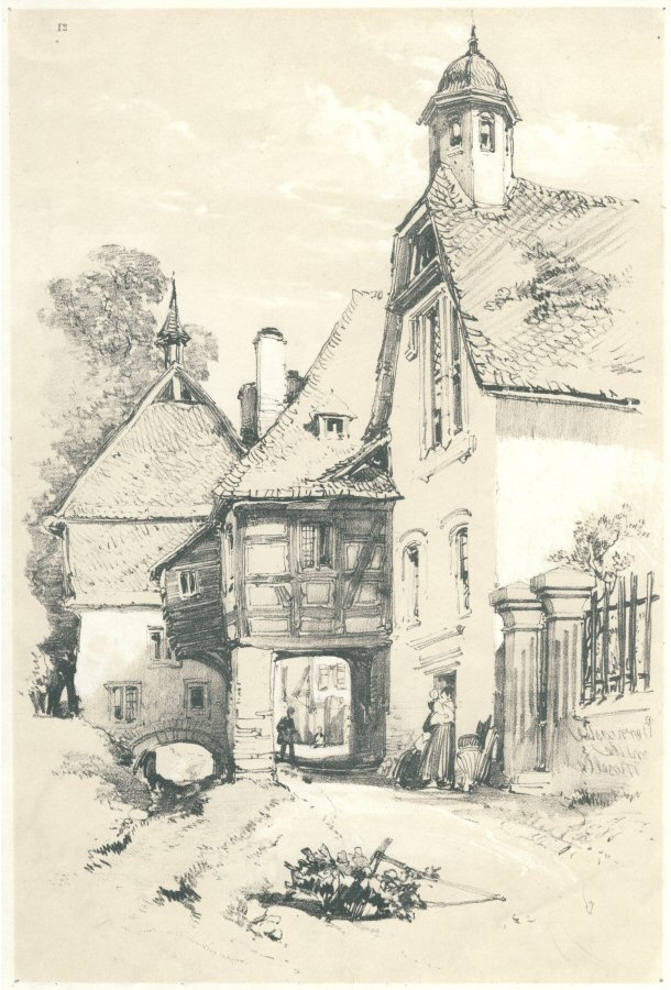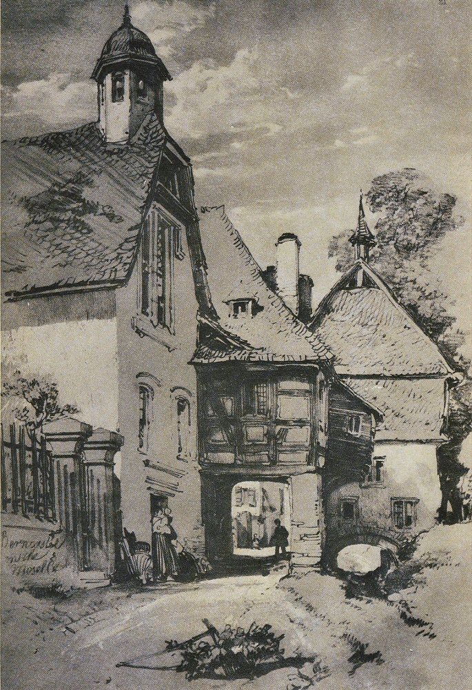 Bernkastel - Teilansicht nach Harding um 1838 (Vorstadtpartie), Bleistiftzeichnung?, signiert R.H.M. 1838 - spiegelverkehrt.