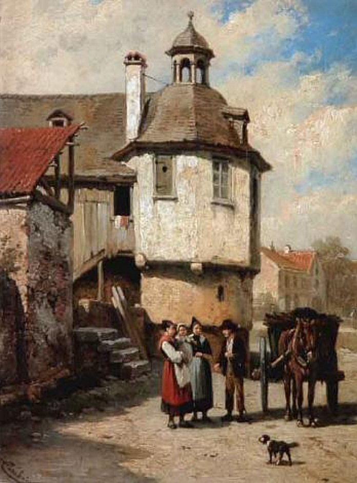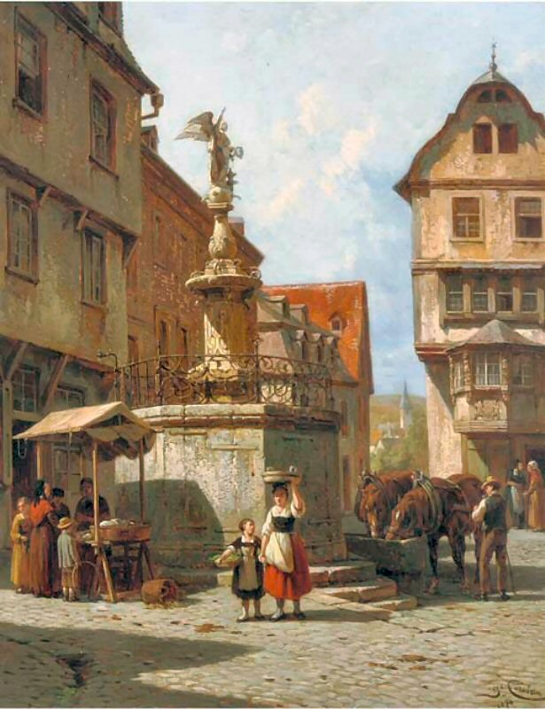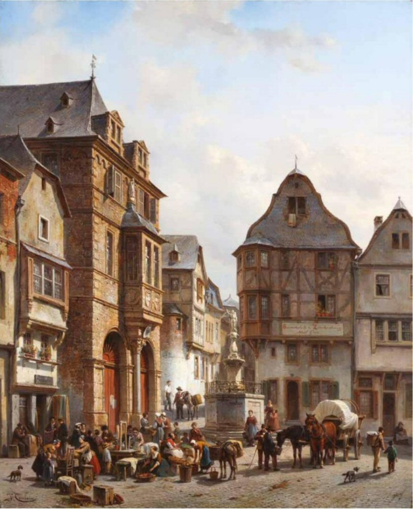 Etwa 1862: "Market Scene Berncastel", von Jacques François Carabain, Belgien, 1834 - 1933