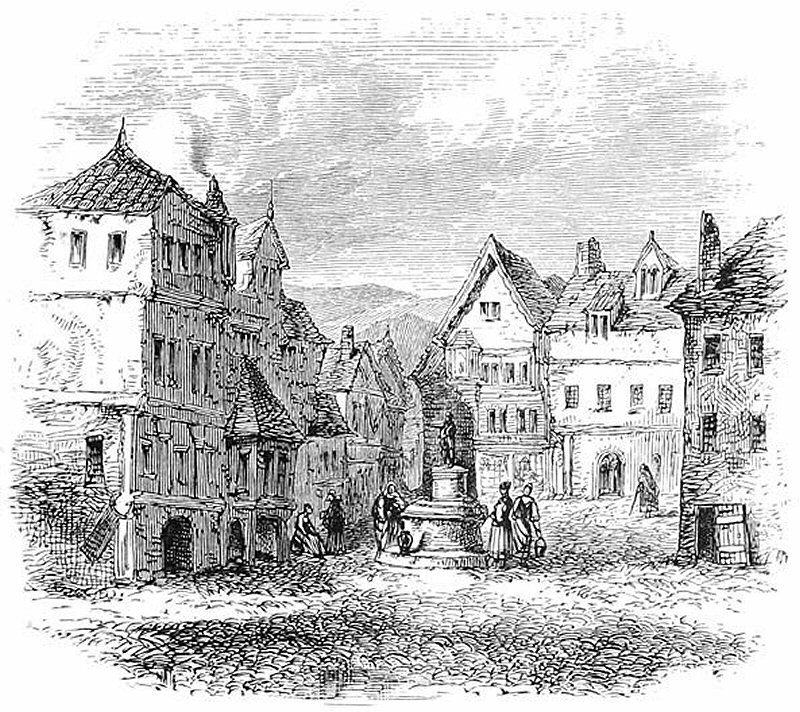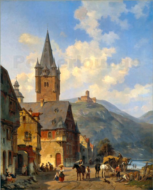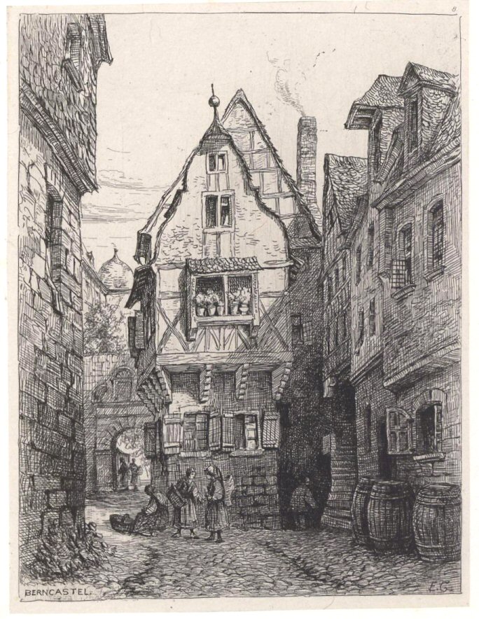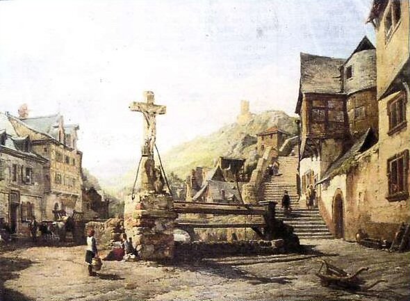 George Clarkson Stanfield "at Bernkastel on the Moselle". Das Bild zeigt eine Straßenszene an der Ecke Römerstr., Burgstr., Kapuzinertreppe & Doppelkreuz.