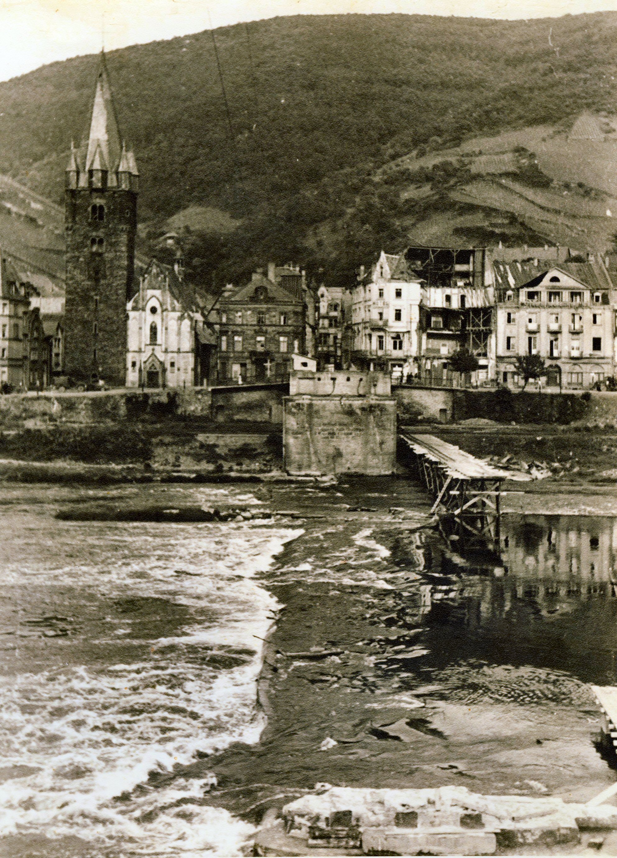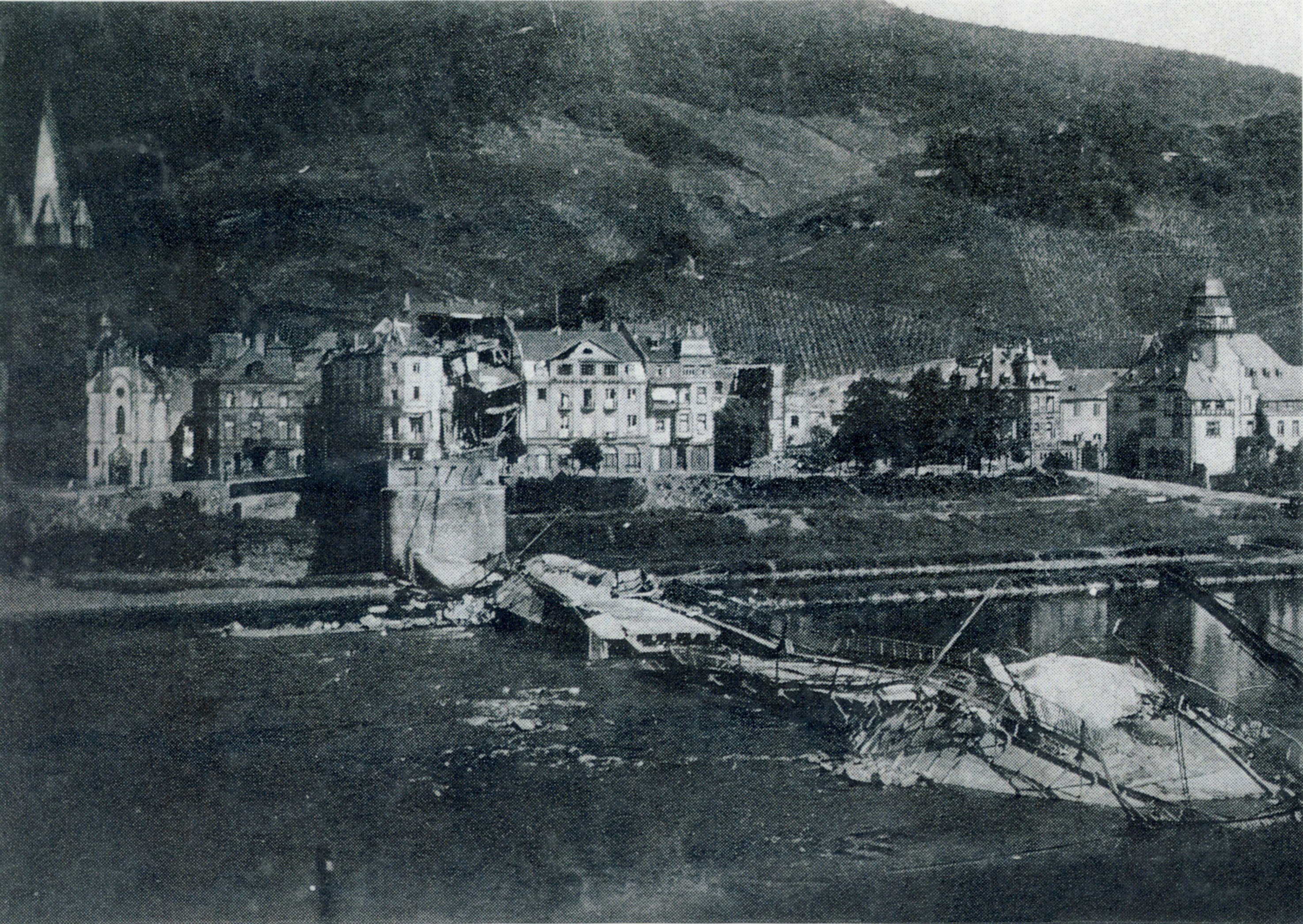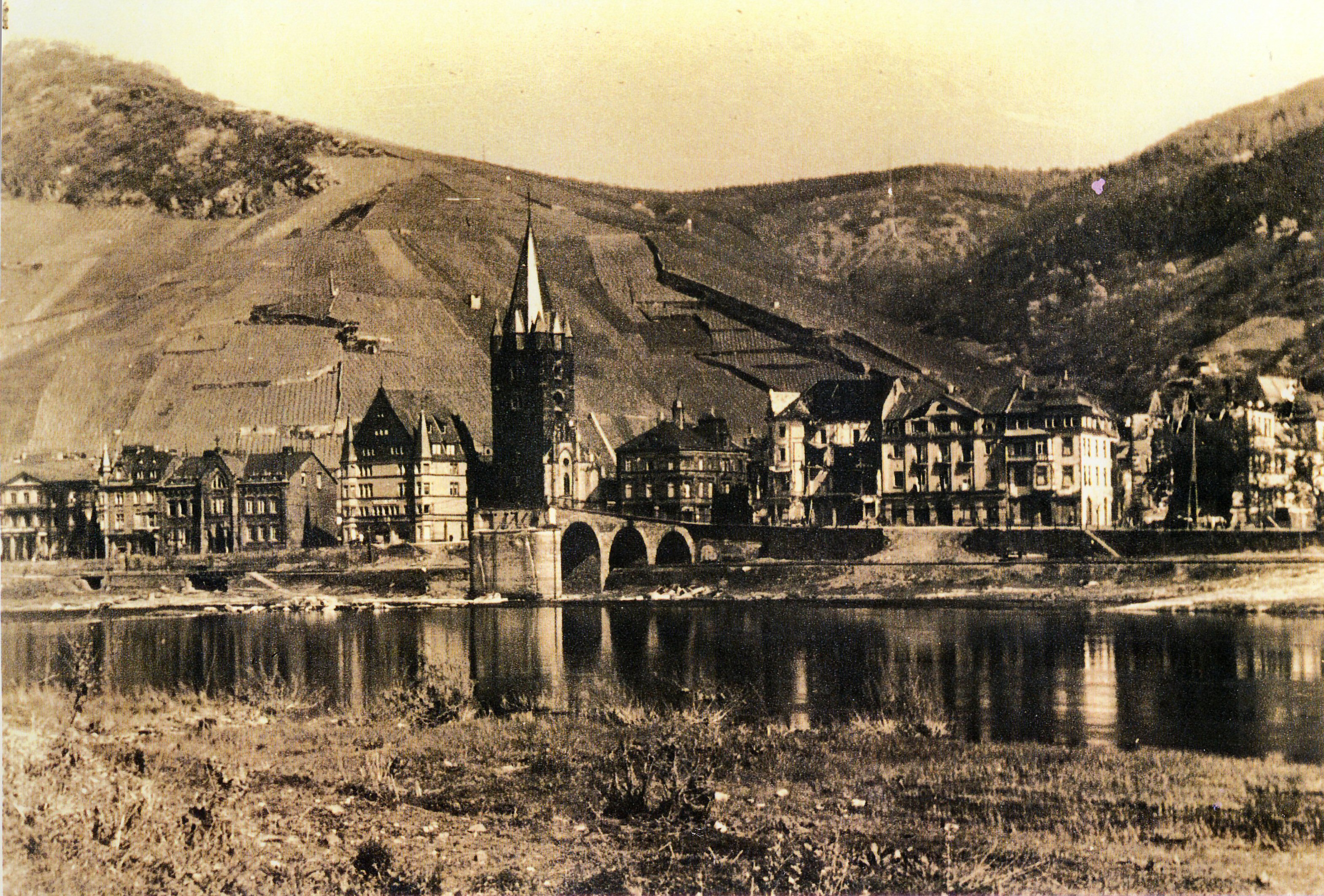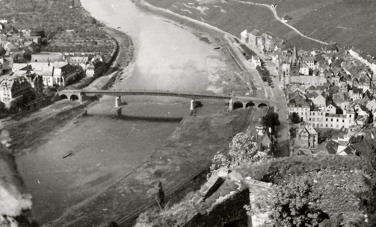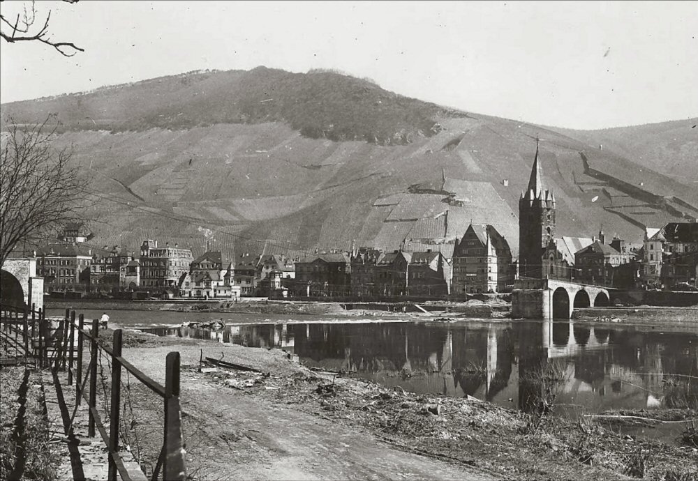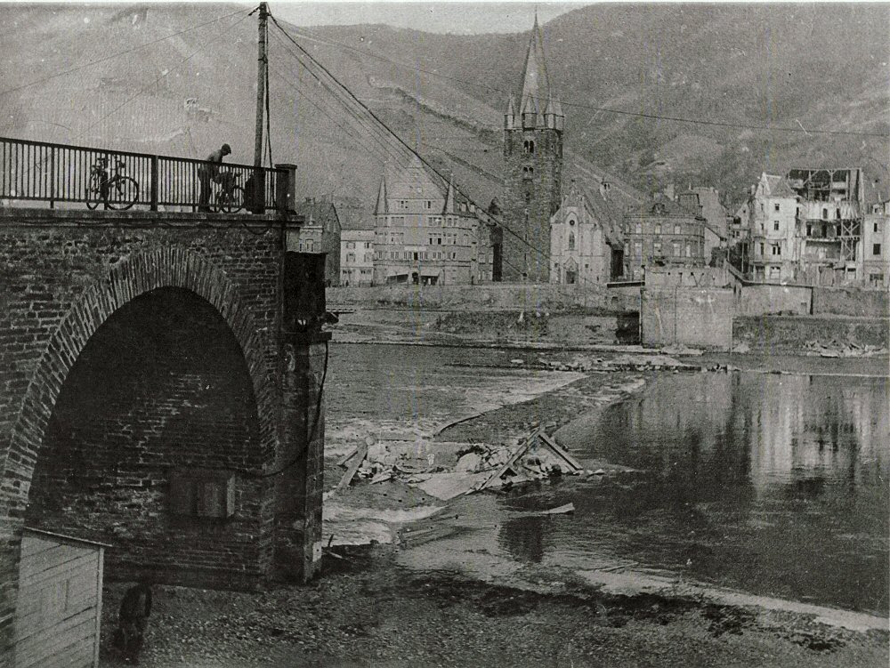 Etwa 1945/47 - Blick von Kues aus auf Bernkastel. Die Brücke gesprengt, die Gestademauer unterm Hotel Landshut zerstört.