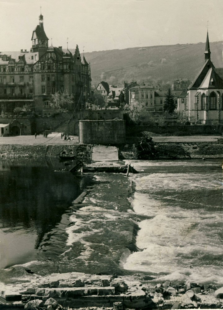 Wohl das früheste Bild nach der Sprengung der Brücke. Man sieht auch deutlich die Schäden der beiden Luftangriffe vorher: Alte Kellnerei (Ehses-Griebler),