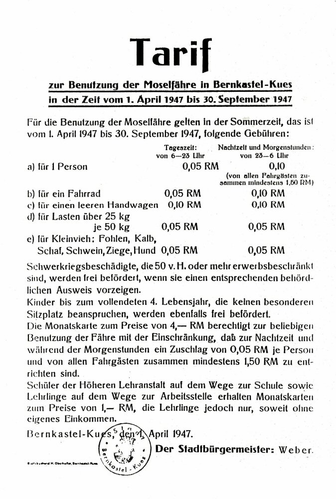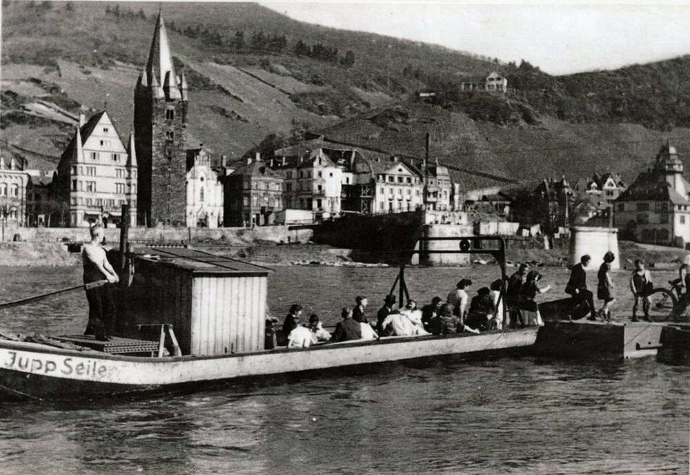 Ab Mai 1945 konnte in Bernkastel-Kues mit dem irgendwie bis BKS abgetriebenen Kahn "Jupp Seiler" (einem bekannten Fährmann in Trier)