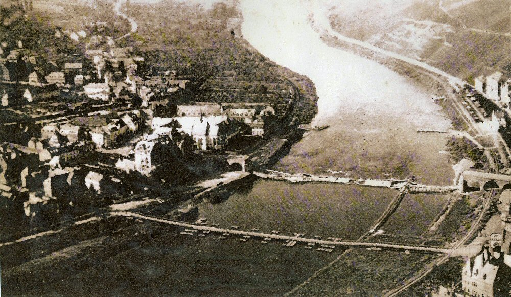 Luftbild 1945: Hier sieht man zwischen Pontonbrücke und dem Bernkasteler Brückenkopf die zerstörte Gestademauer und oberhalb davon den