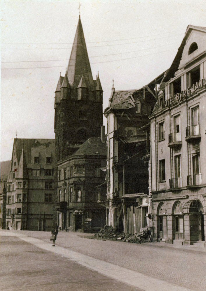1946/47: Das Haus Astor war ein "ECONOMAT MILITAIRE" - also ein Militärkaufhaus. Fast auf dem ganzen Dach sind die Schiefer weg! Sicher eine Folge der Brückensprengung in 1945.