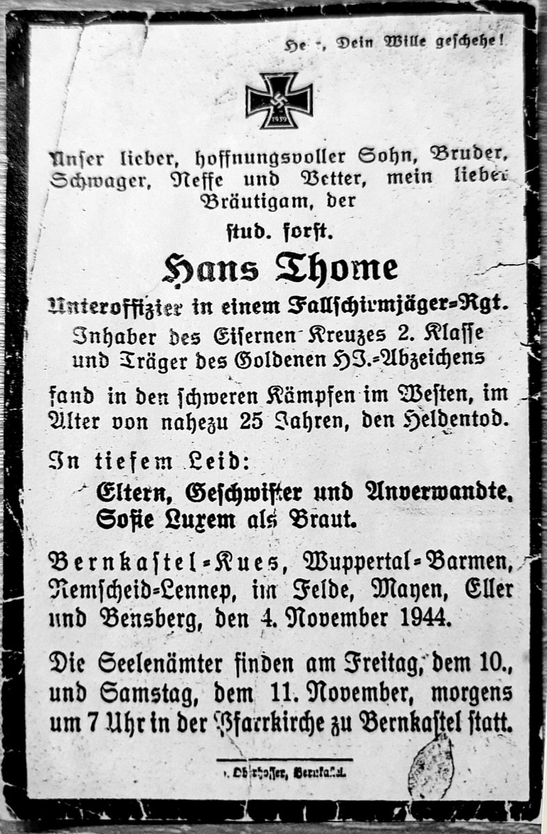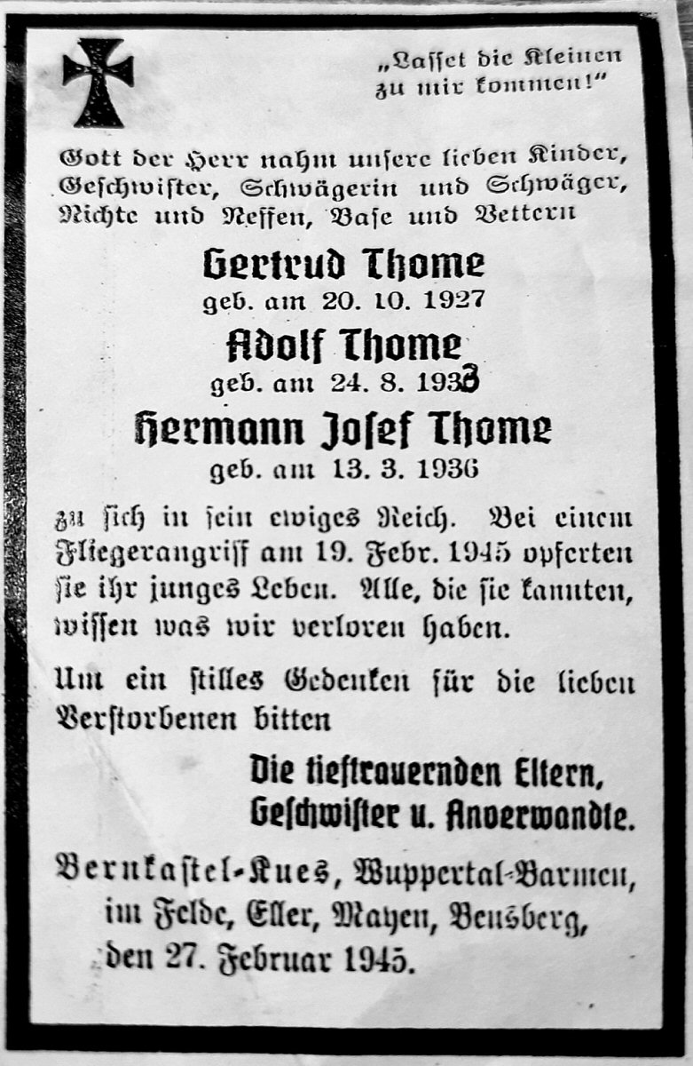 Die Tragik ist, dass Gertrud Thomé nur knapp 4 Wochen später bei dem ersten großen Bombenangriff auf Bernkastel ums Leben kam. Die Familie Thomé