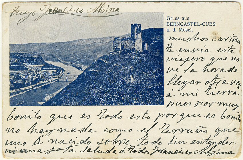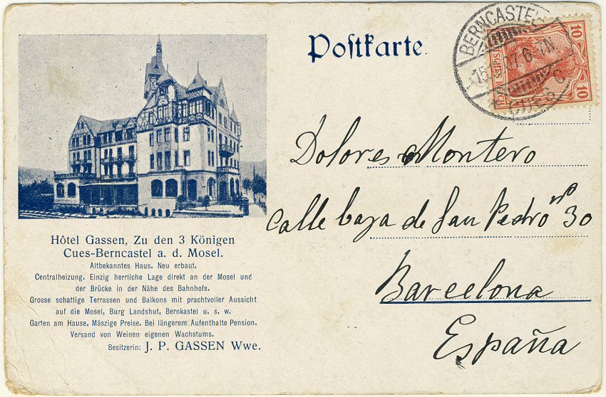 gelaufen am 5.10.1907 6-7 nachm. von Berncastel-Cues nach Barcelona.