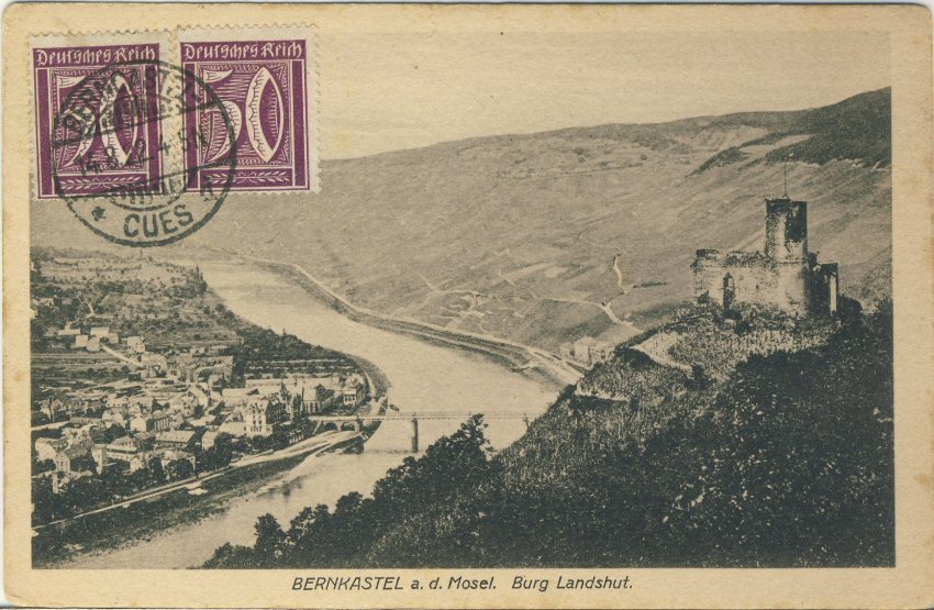 gelaufen am 14.8.1922 von Berncatel-Cues nach Trier, gesendet von einem Franzosen, die klebten die Marken auf die Bildseite, die Post hat es mitgemacht.