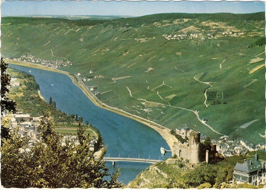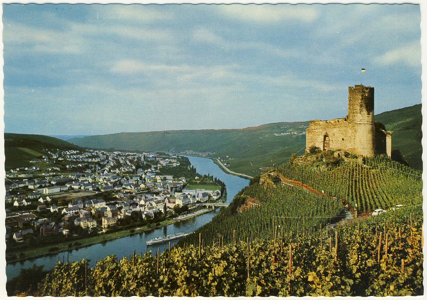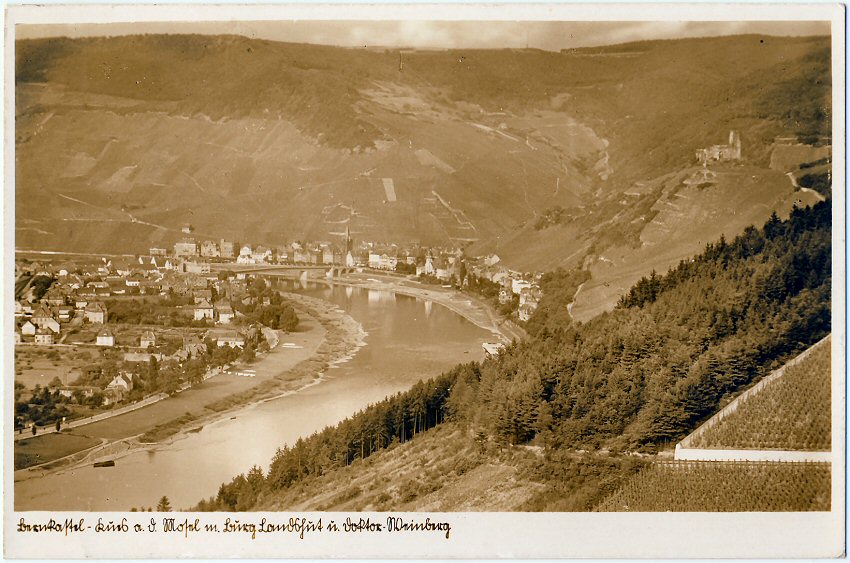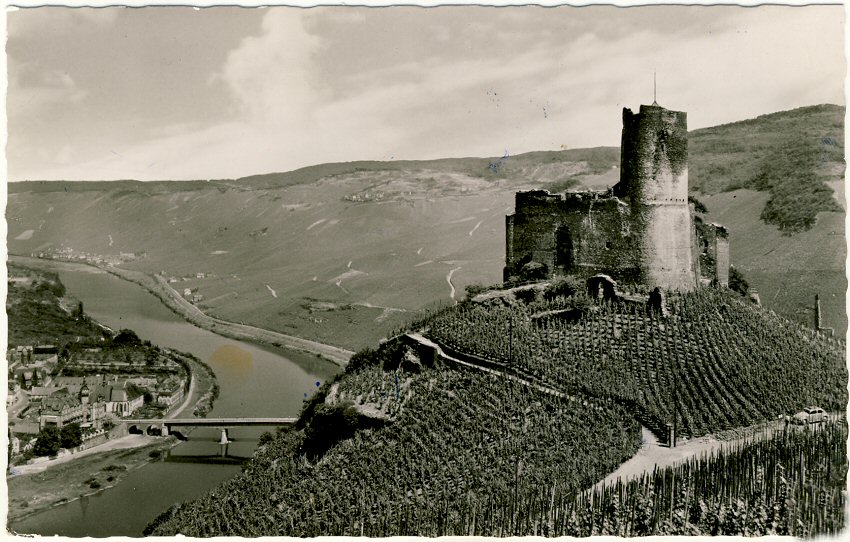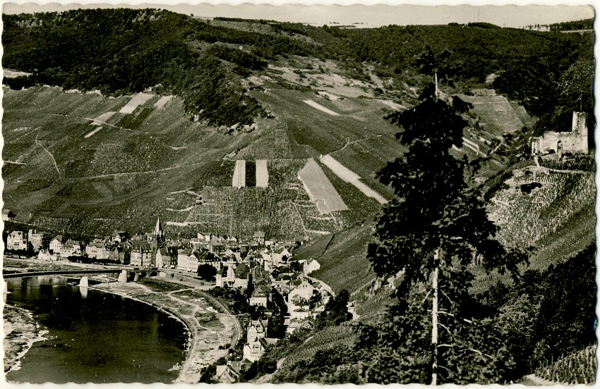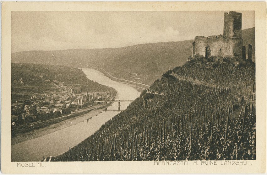 "Bernkastel-Kues a.d. Mosel m. Burg Landshut u. Doktor-Weinberg" - optisch verbessert da stark gebräunt wegen Foto-Entwicklungsmängeln.