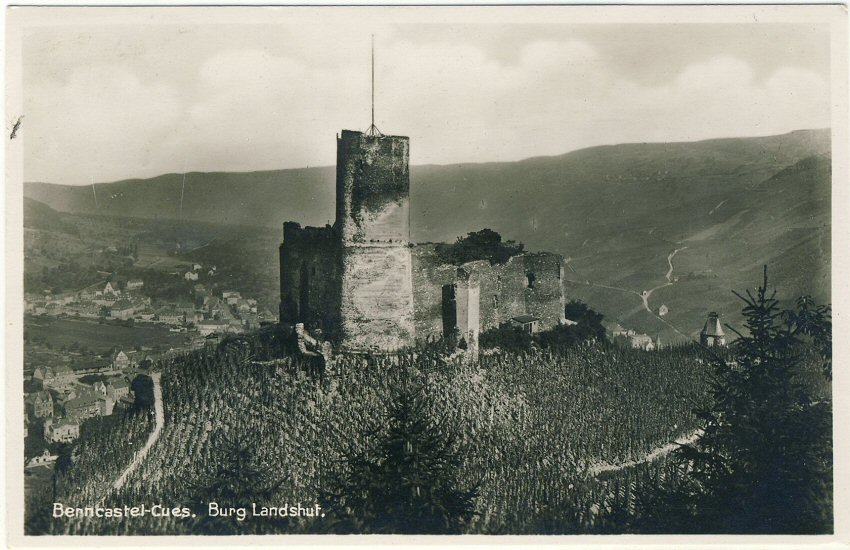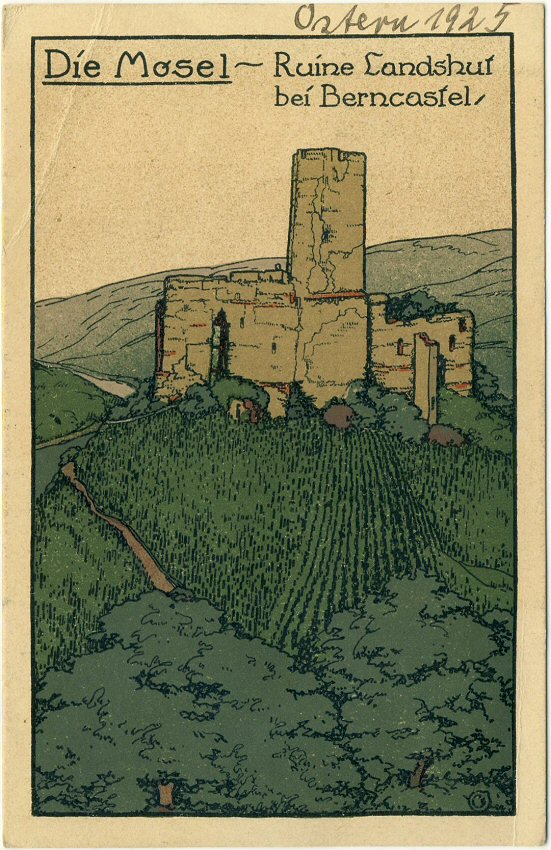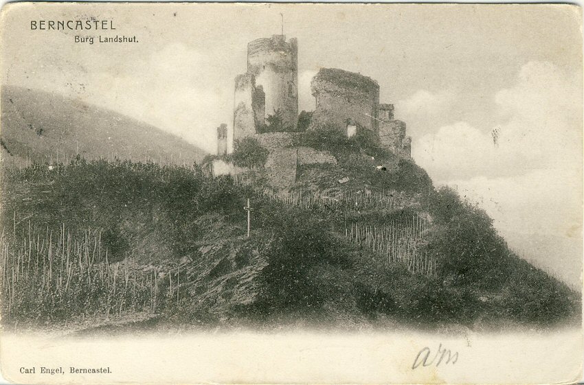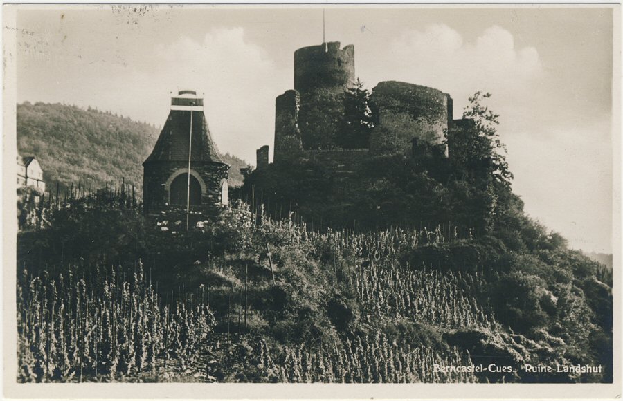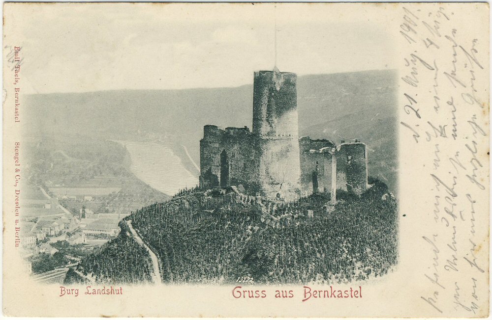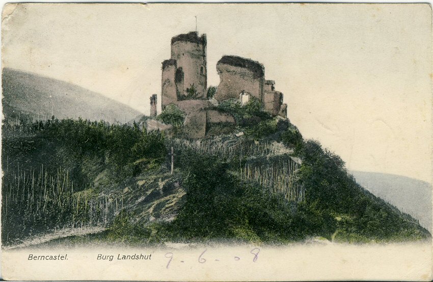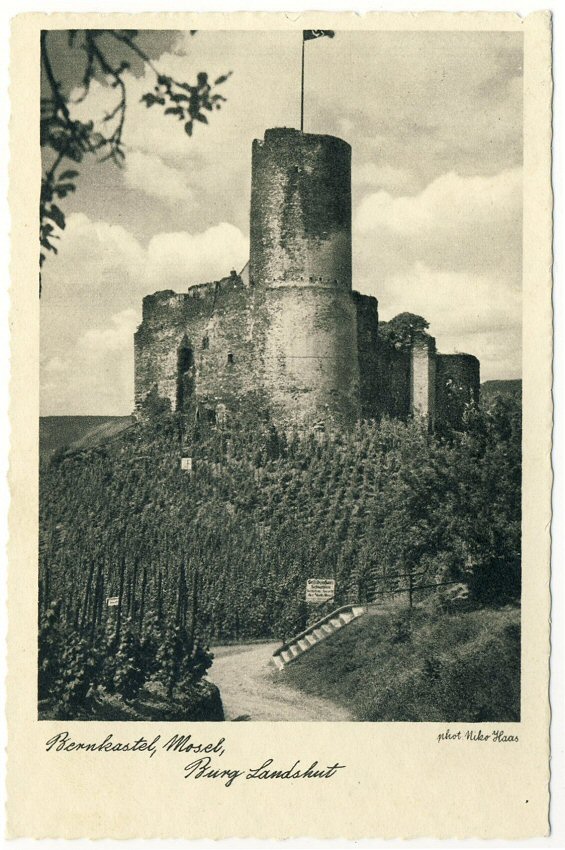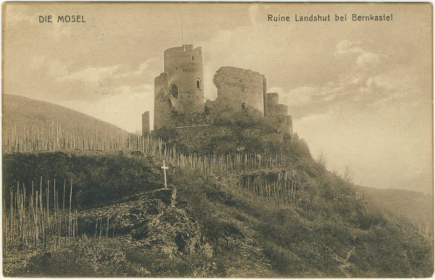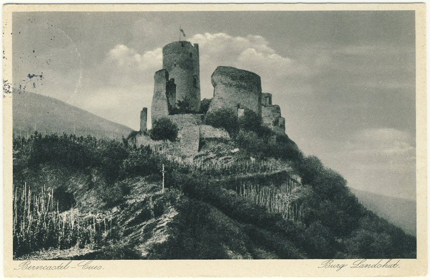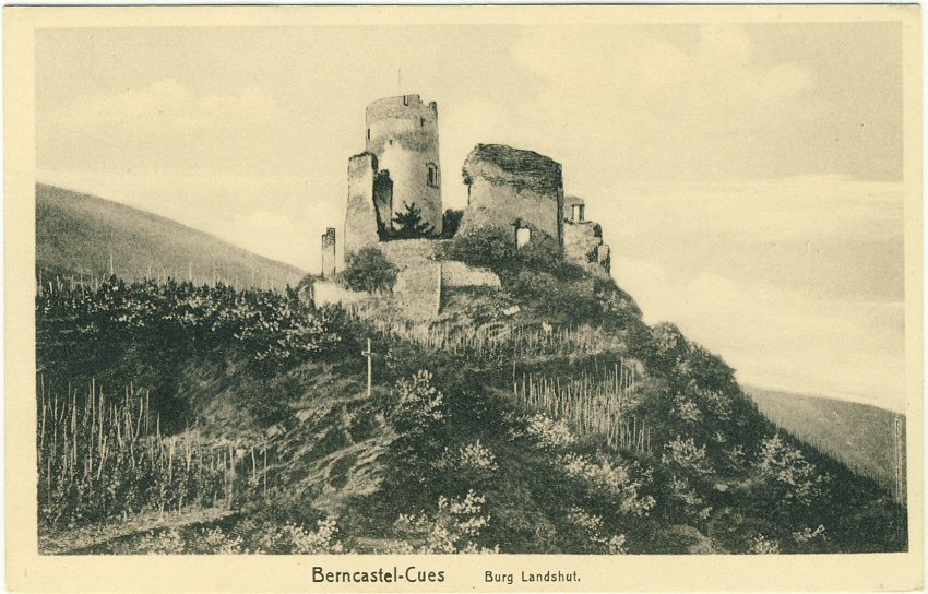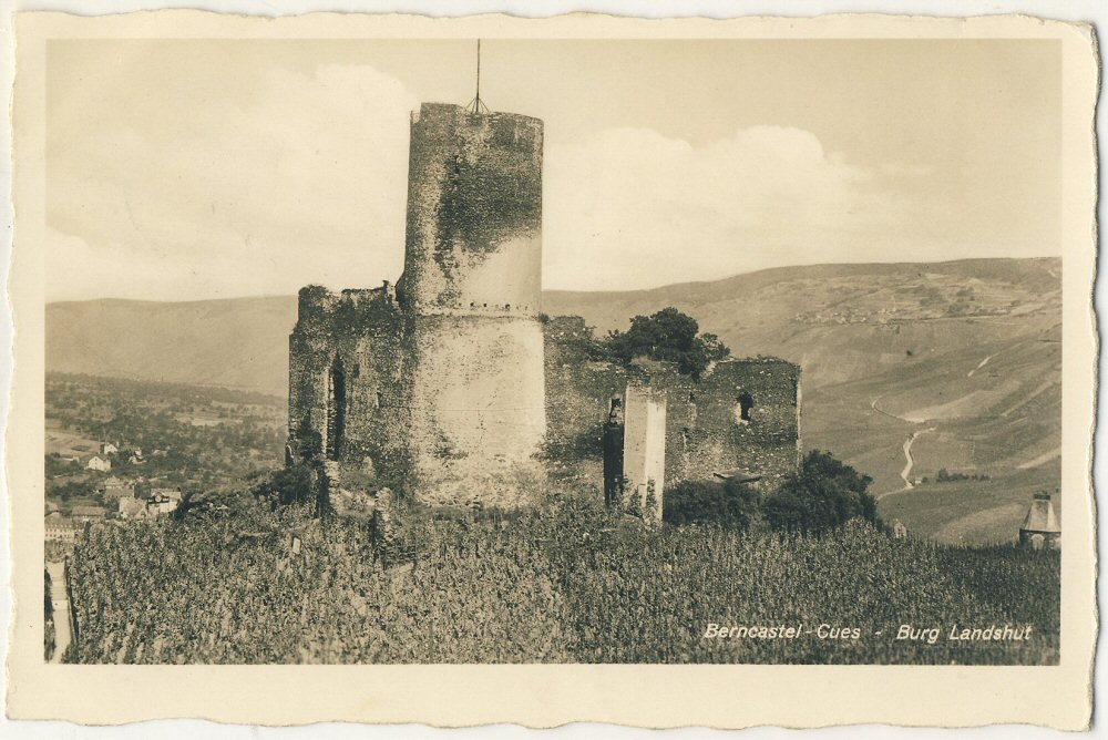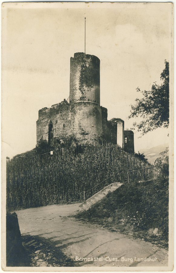 "Berncastel-Cues Burg Landshut": Stempel auf der Rückseite: "Weinhandlung Peter Dahm, Berncastel/Mosel, Weinstube zur Post"