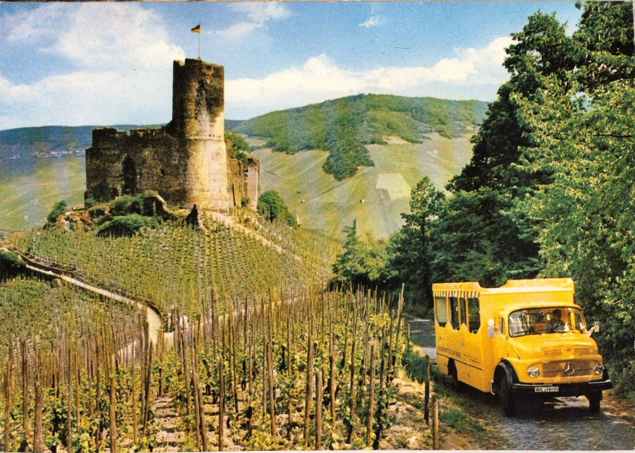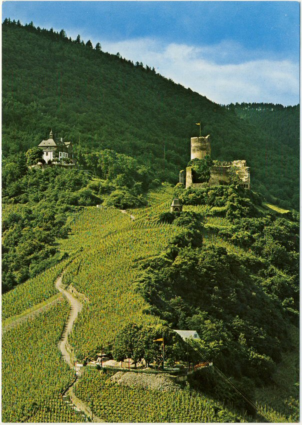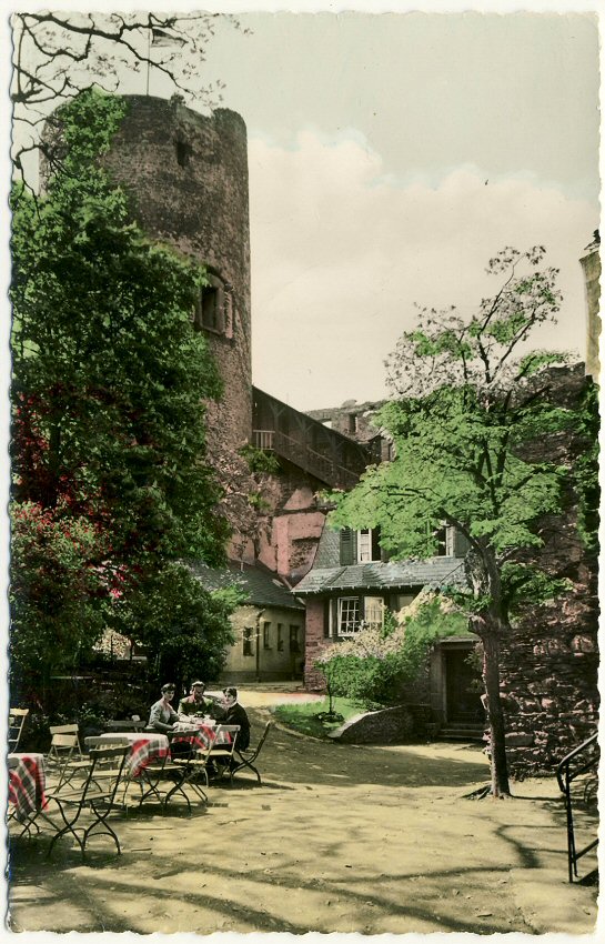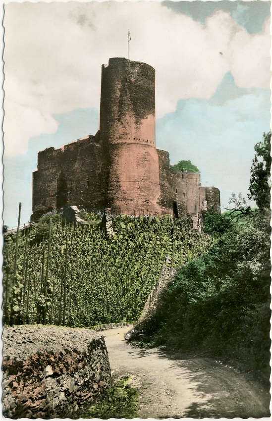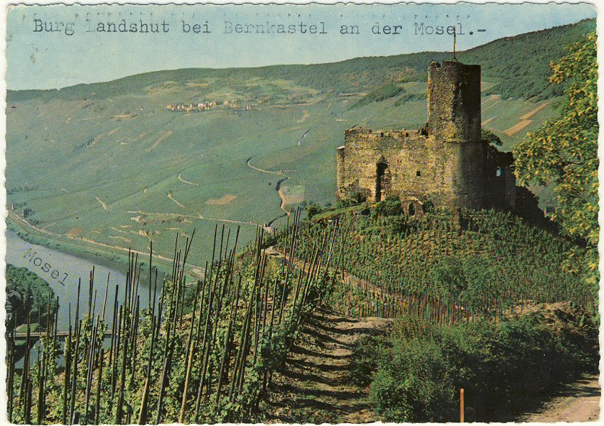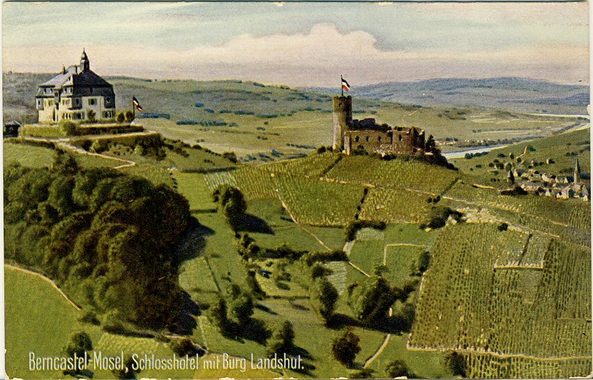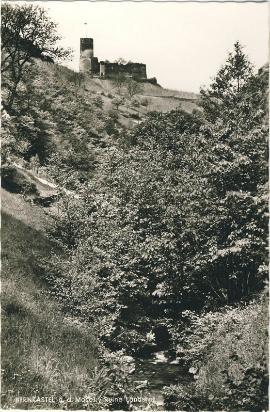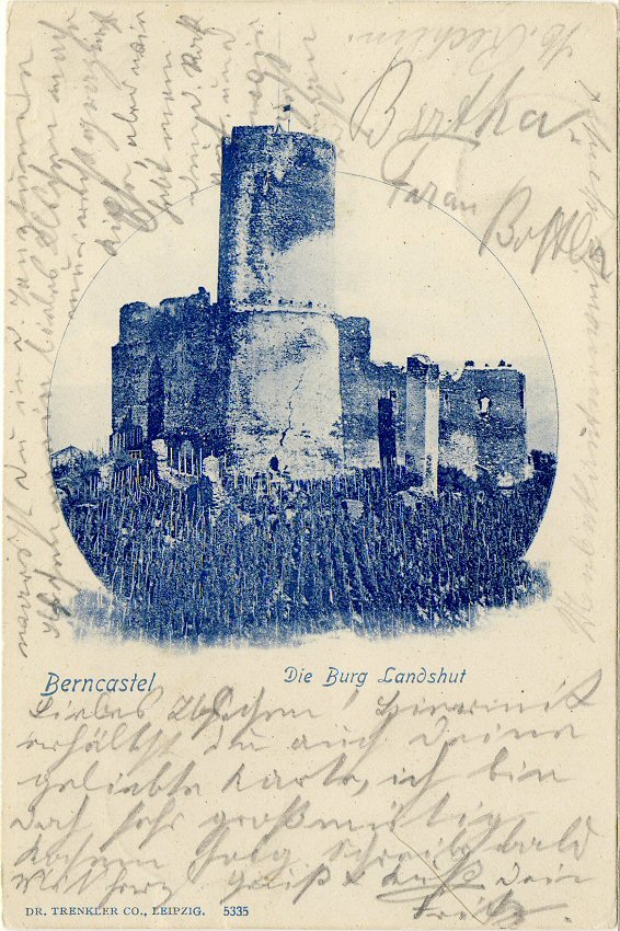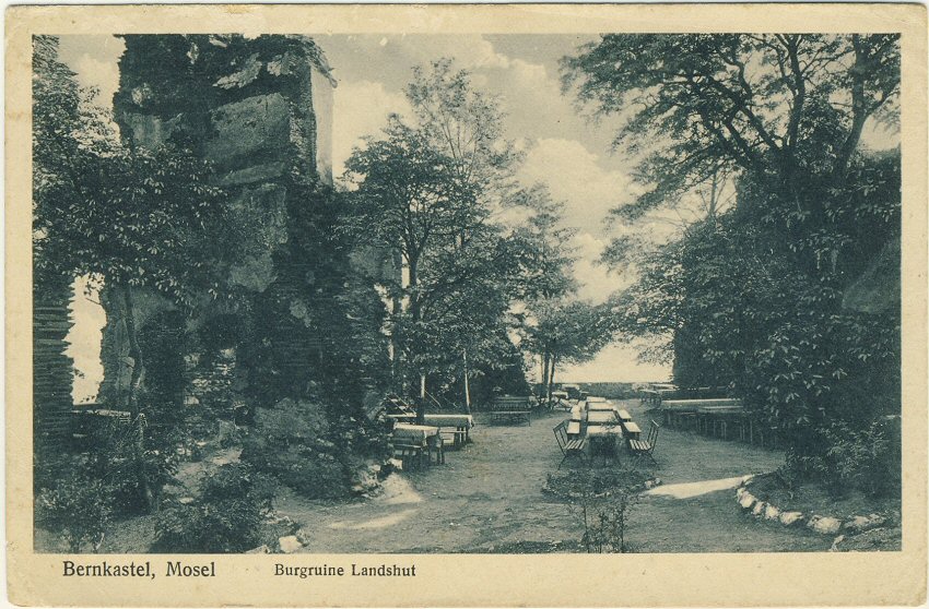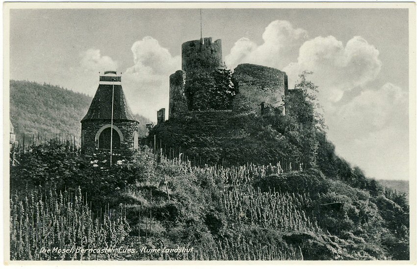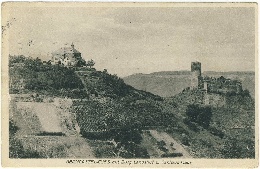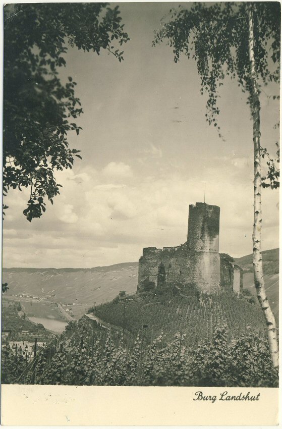 "Berncastel-Cues Burg Landshut": Stempel auf der Rückseite: "Weinhandlung Peter Dahm, Berncastel/Mosel, Weinstube zur Post"