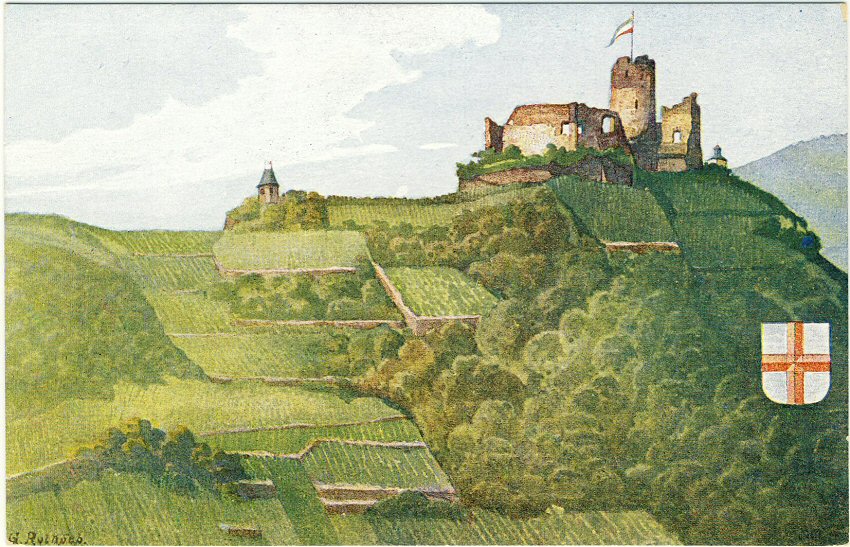 "Burg Landshut bei Bernkastel": Aus einer Serie "Deutsche Burgen und Schlösser", die Mosel, Maler Gg. Rotgeb.