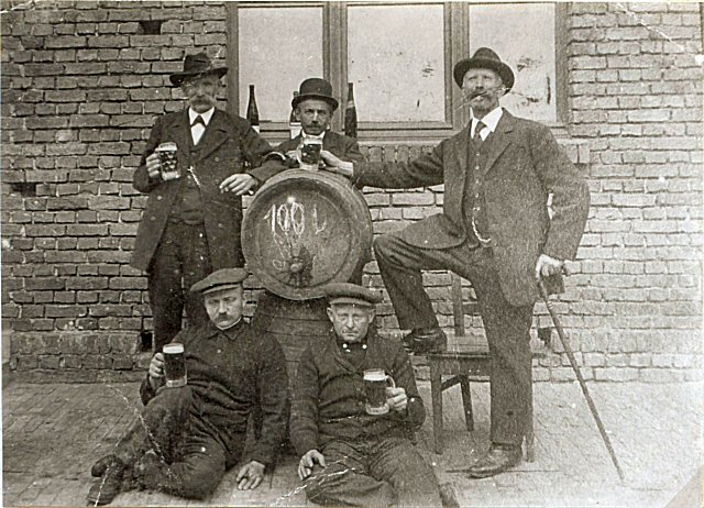 Ob sie diese 100 Liter wohl gepackt haben? Der Herr vorne links sieht schon etwas geschafft aus! Photo aus den 1920ern.