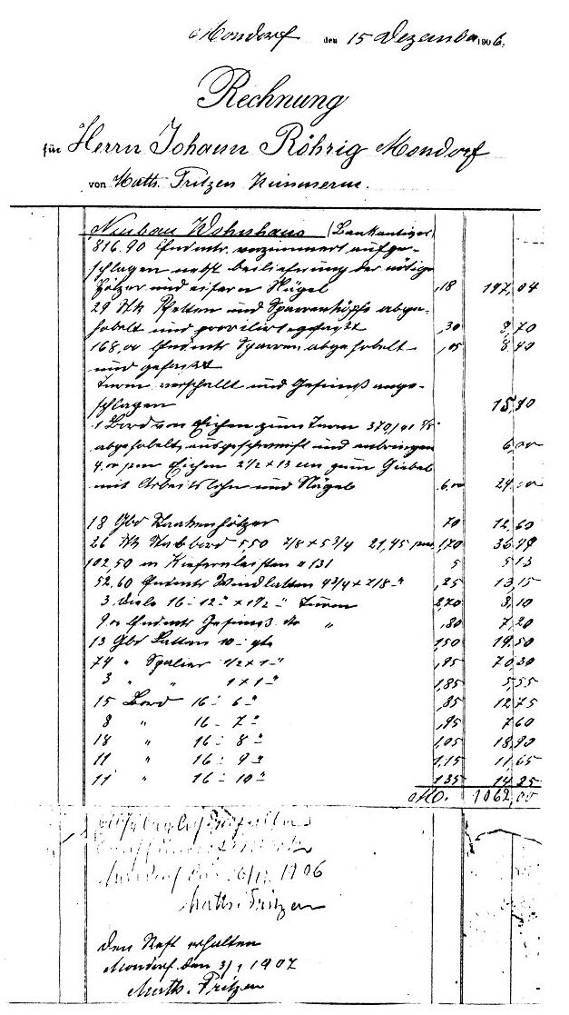 Rechnung von 1906 des Zimmermanns Mathias Fritzen für die Dachstuhlarbeiten am