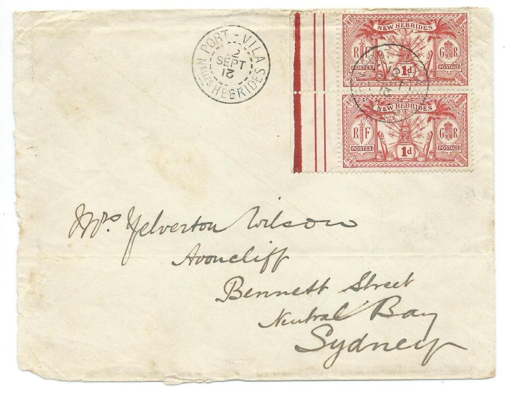 'Port-Vila 26 AOUT 12' cds with the inverted "2" as usual throughout the year 1912 [PCH 5A].