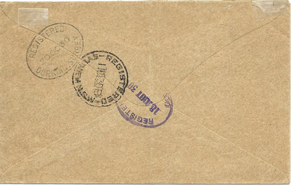 Registered Postmaster cover (front only) to England. The 2F50c - 2/- stamp camcelled PM7A, registration cachet NR5. This is the only cover with