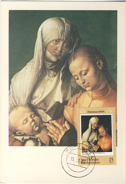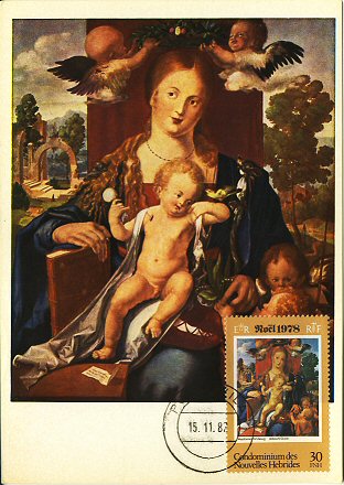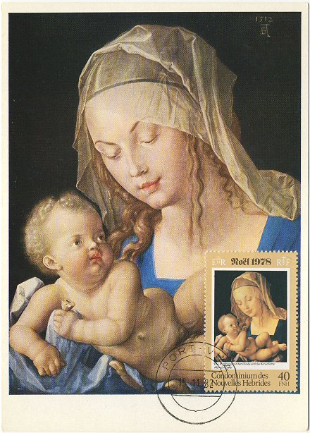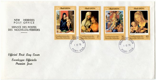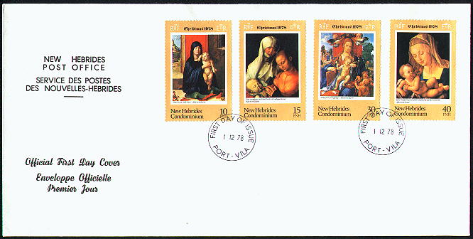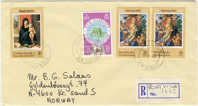 The stamp Noël 1978 tied with the first day cancel PS4D, the stamp Erromango island with PM31C. ("SeSi" coll.)