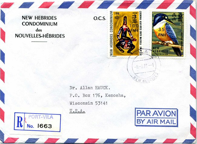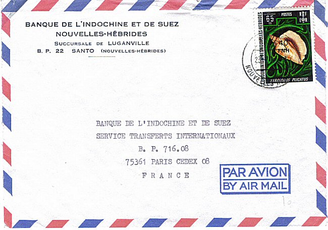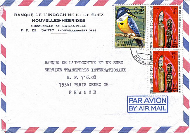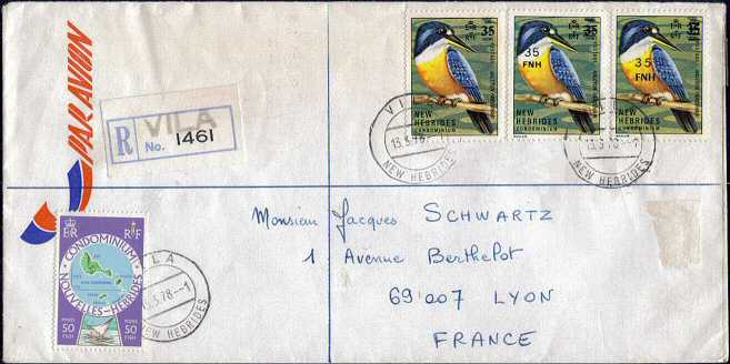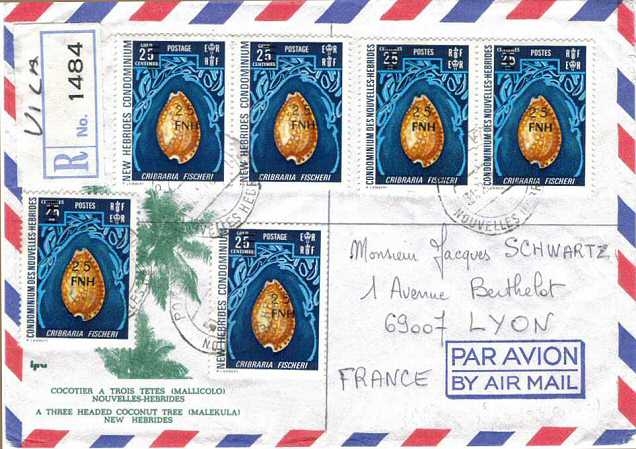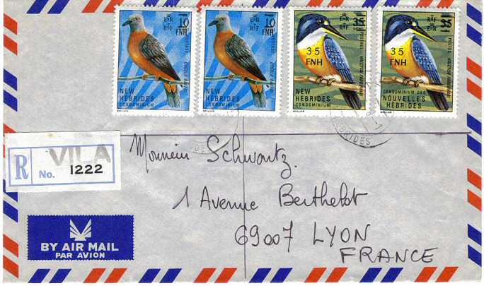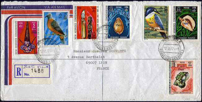 Registered air mail cover from Santo to France with a 70 FNH provisional and a 1977 20 FNH definitive. (Benoît Lebourcq coll.)