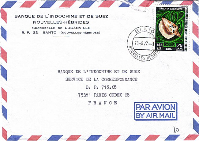 Air mail cover from Banque de l'Indochine Santo to Paris 08.