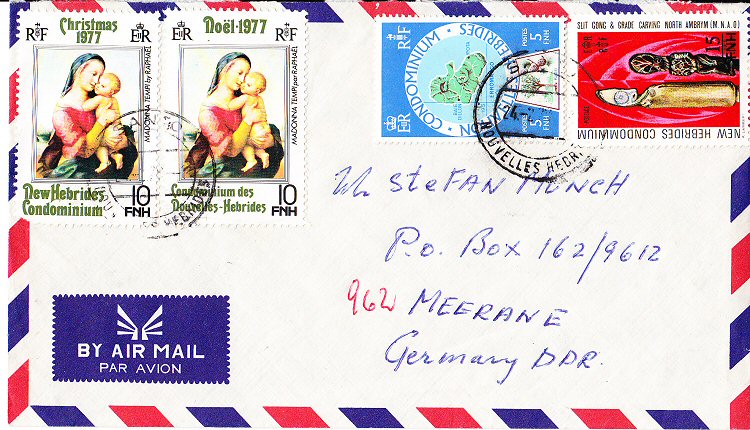 Nice destination: Santo to German Democratic Rebublik: Two 1977 10 FNH Christmas stamps, a 5 FNH maps stamp and a 1976 Paris overprint 15 FNH provisional