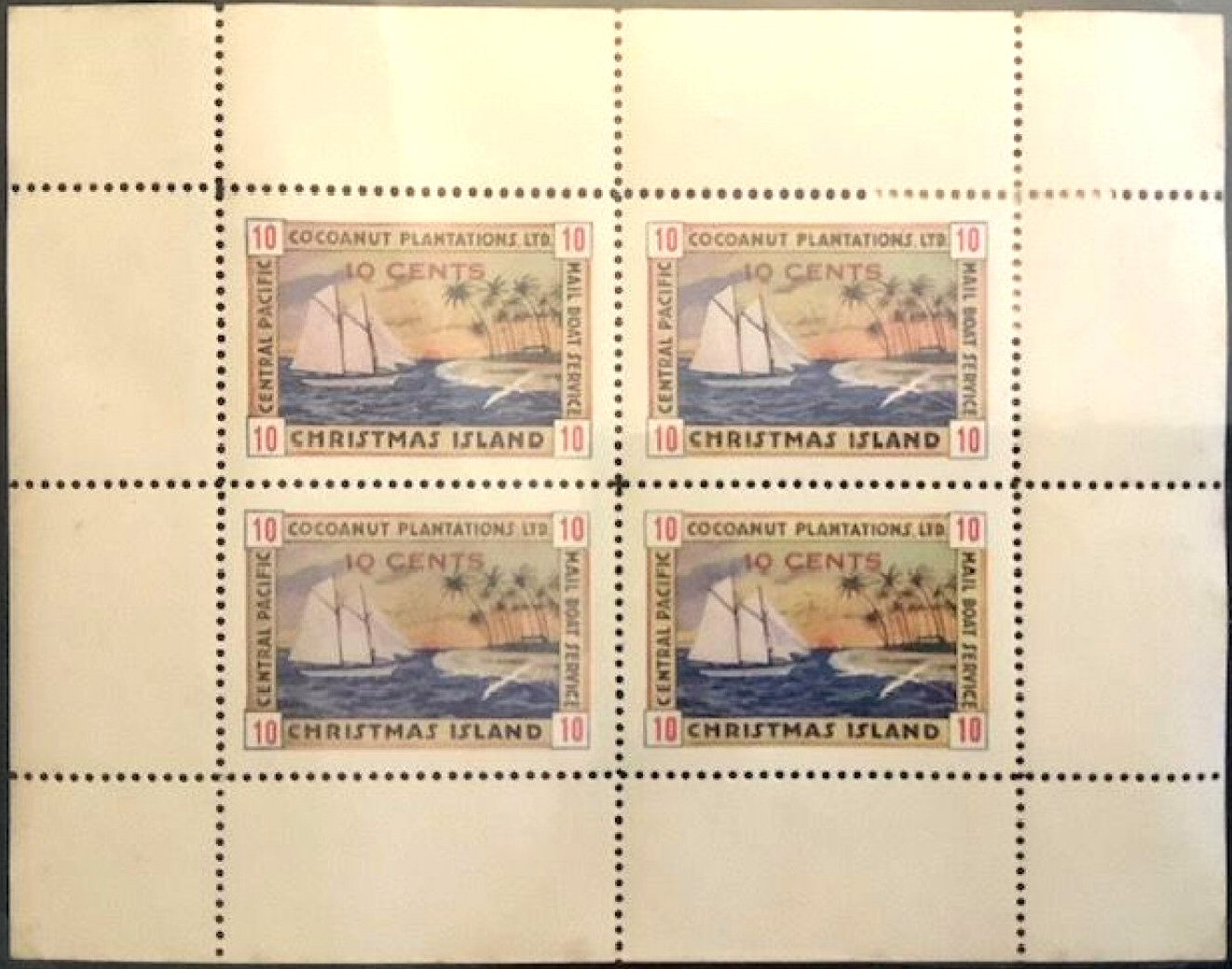 the inscription "10 CENTS" appeared in the sky at the top of the stamp. The sheet formation consisted of a block of four